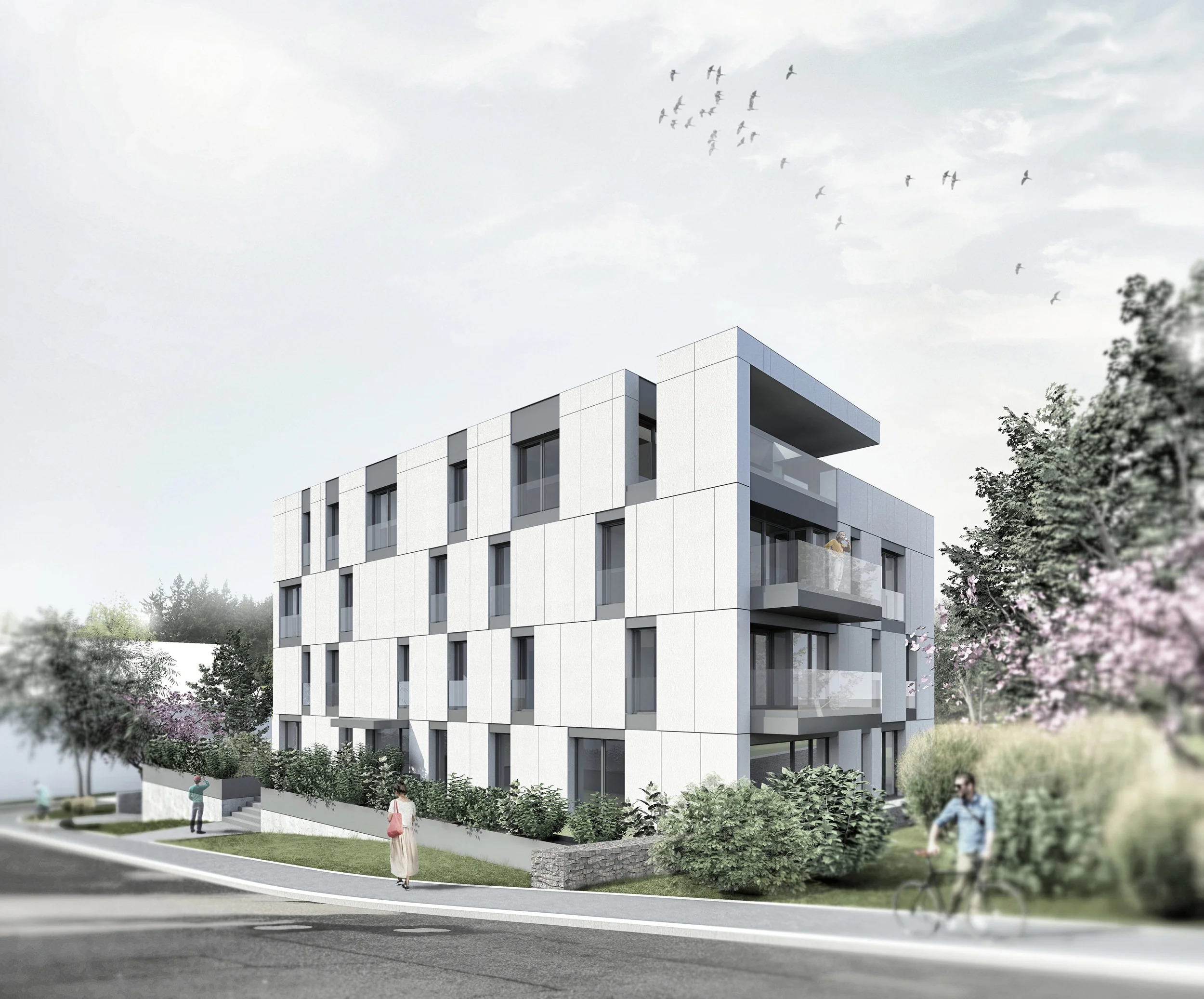 The use of fiber cement panels in light shades gives a monolithic aspect to the whole, while preserving the calm look. The building appears as a sleek, clean geometric volume, interrupted by a game of different window typologies. The presence of juxtaposed balconies, in a form of ruptures in such a compact volume, contrasts to the rather horizontal and closed aspect of the facade facing the street. Through a strong but rather elegant formal game, the building emerges with the asserted architectural identity.