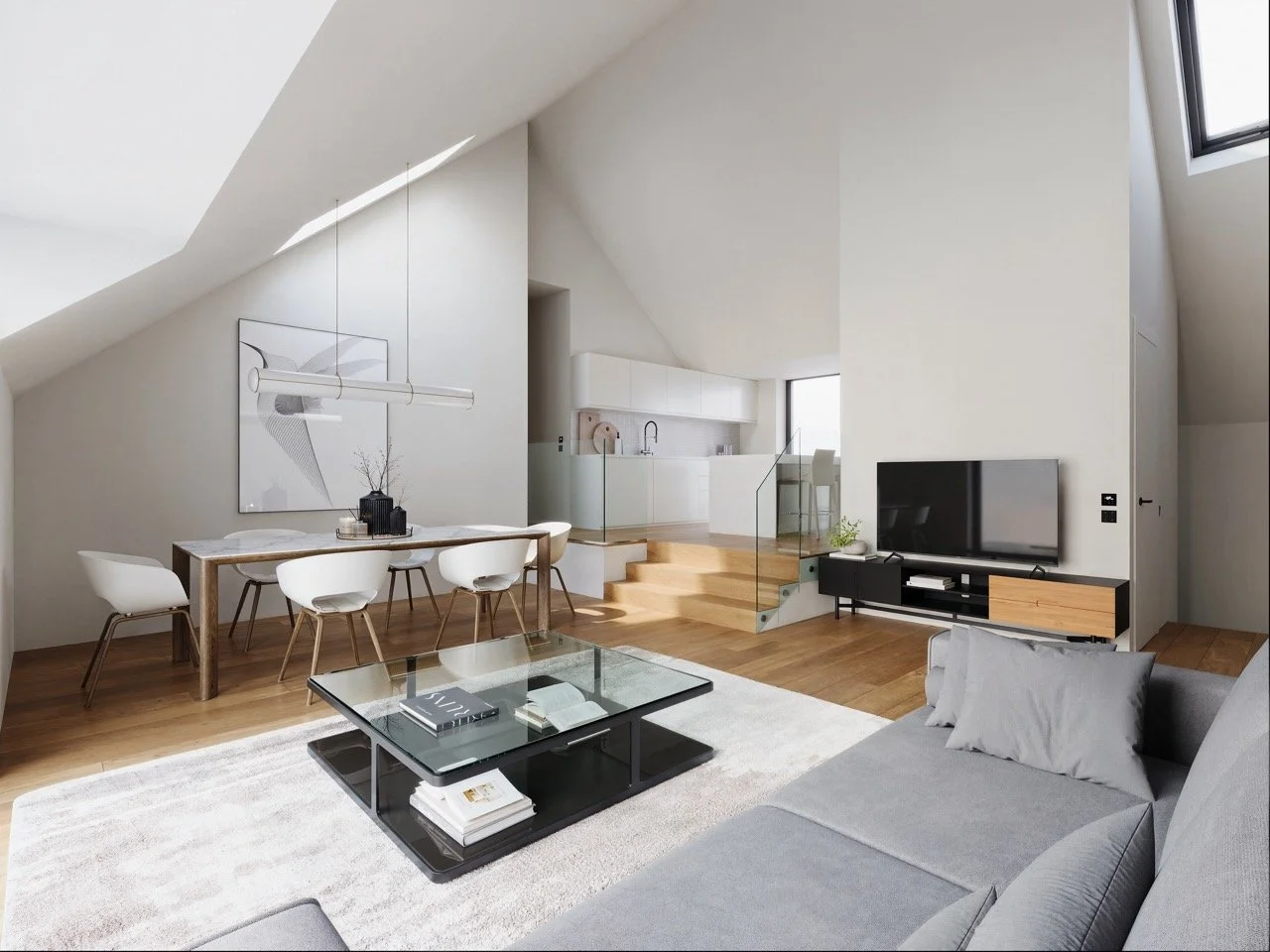 Projet de 6 résidences jumelées en construction passive sur des niveaux surélevés. Le caractère de l'architecture contemporain promet à ses futurs occupants un confort lumineux par ses baies vitrées dominantes. La zone de jour sous combles prévoit un grand espace regroupant le living surplombant la cuisine et la salle à manger en demi niveau. Un accès direct mène sur une belle terrasse spacieuse et offre une vue admirable sur la forêt. Au 1er étage, les zones de nuit sont composées de 1 chambre à coucher qu'une salle de bain et un WC séparé. Les résidences bénéficient également de garages intérieurs et de caves spacieuses.